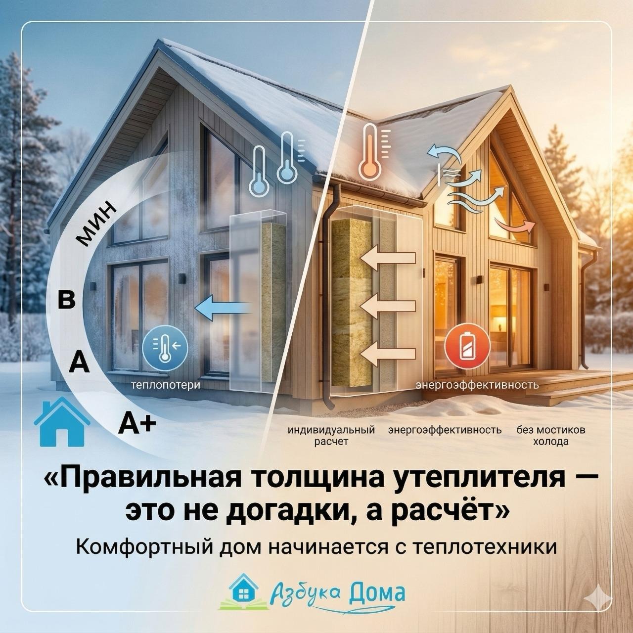 Компания «Азбука Дома» специализируется на строительстве домов для постоянного проживания, поэтому мы самым тщательным образом относится к расчету теплотехнических показателей. Цена исправления ошибки в этом вопросе колеблется от “дорого и очень дорого” до “дешевле снести и построить новый”. В своей работе мы не ориентируемся ни на опыт соседа ни на средние значения по региону. Мы выполняем индивидуальный теплотехнический расчет для каждого проекта. Это позволяет нам точно определить необходимую мощность оборудования, толщину утеплителя и тип стеклопакетов окон. В расчете мы учитываем ключевые факторы: