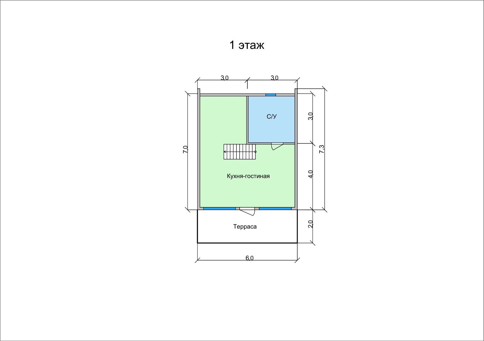 Его площадь составляет 55 м2. На входе обустроена аккуратная терраса. Первый этаж отведен под кухню-гостиную, пространство которой при желании можно зонировать мебелью или перегородками. Здесь же расположен санузел. Поднимаемся на второй этаж: уютная спальная зона с одной стороны и антресоль – с другой.