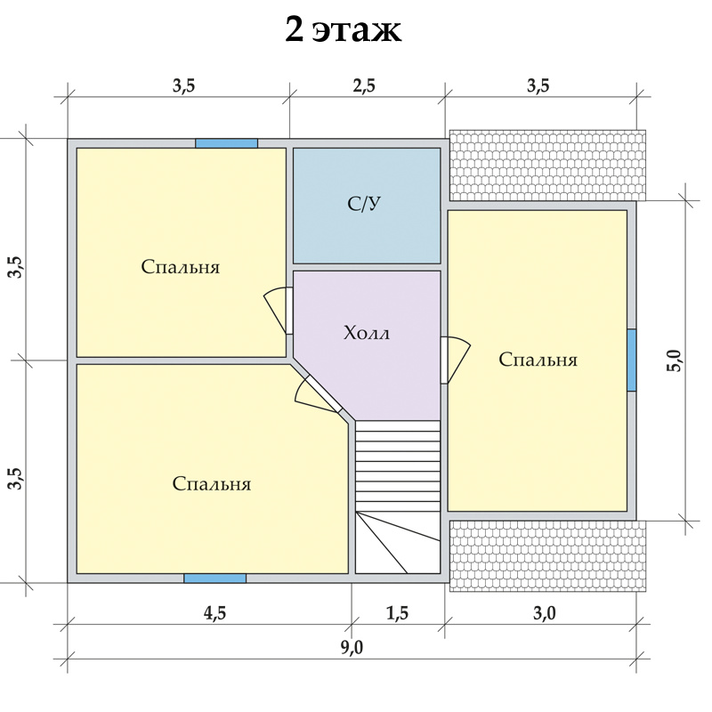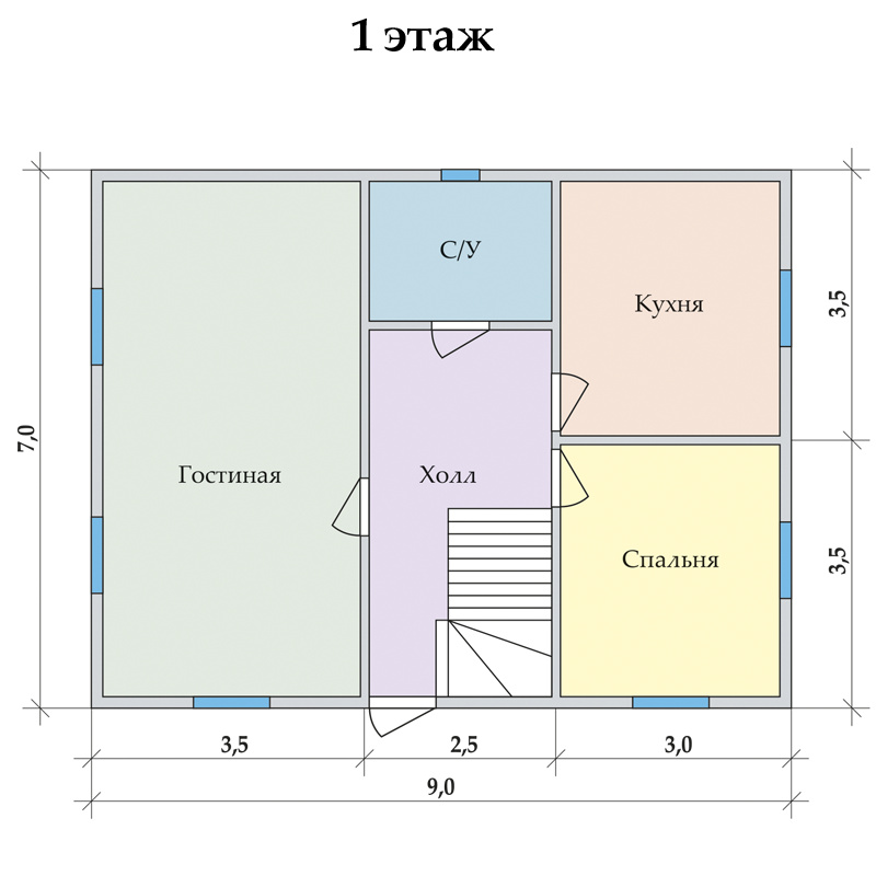 Коттедж «Гармония 7х9» спроектирован с учетом современной эргономики и климатических особенностей. Столбчатый фундамент из бетонных блоков с гидроизоляцией из рубероида гарантирует прочность, основательность и долговечность конструкции. Крыша из ондулина коричневого цвета с гидроизоляцией – никакие осадки не страшны.