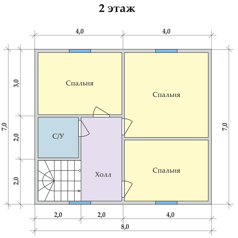 Входные двери металлические, двери в помещениях дома изготовлены из МДФ. Окна металлопластиковые, с двумя стеклами, оснащенные поворотно-откидным механизмом. На мансардном этаже предусмотрены фигурные окна, а также стеклянная отделка балкона в одном из форматов планировки.