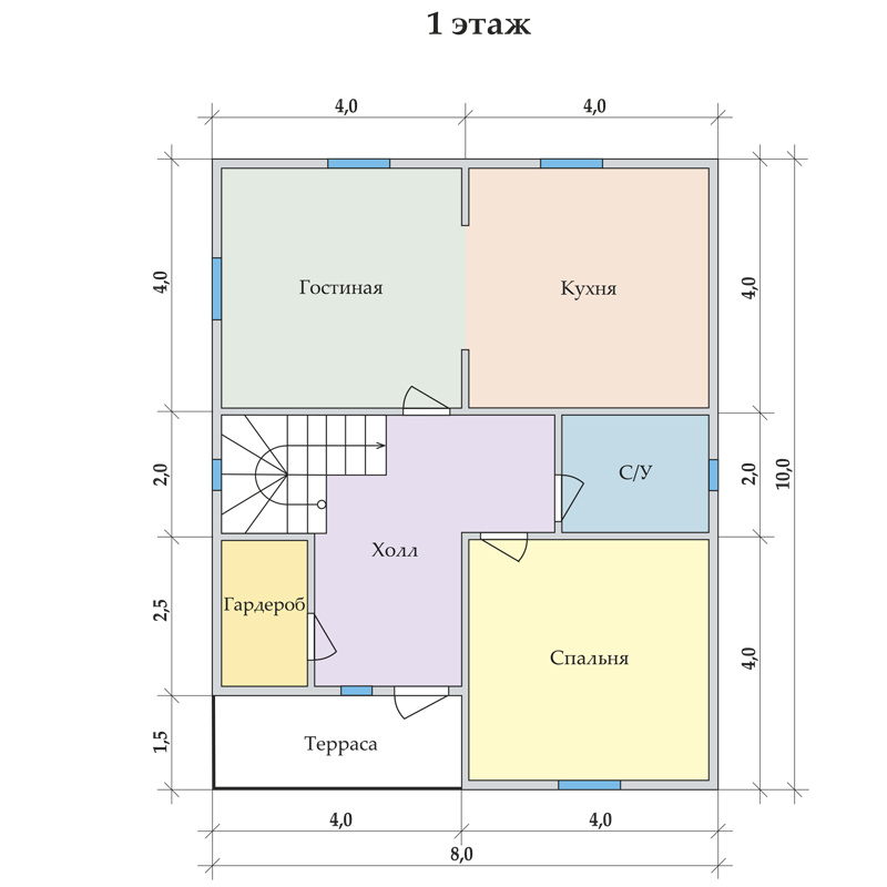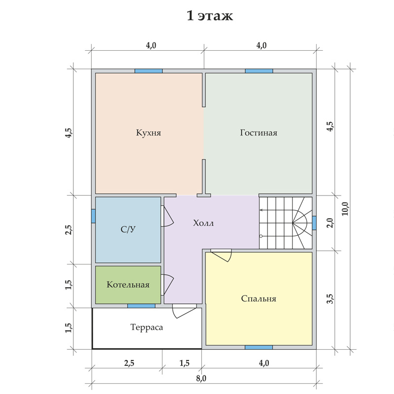 1) Крыльцо с террасой, просторный холл с выходом в гостиную и кухню, соединенные широким проходом. На первом этаже также предусмотрены изолированная спальня, санузел и помещение для бойлерной. На втором этаже три просторные спальни, санузел и гардеробная, а также балкон с выходом из холла.