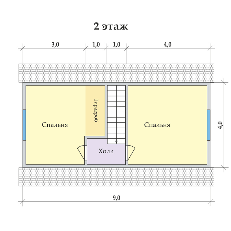 Общая площадь дома 90 м². На первом этаже располагаются изолированные кухня, гостиная и спальня. Поднимаемся по лестнице – и оказываемся в длинном холле, из которого можно попасть в спальни. В одной из спален организована специальная зона под гардеробную.